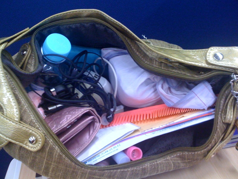 judging from what i am seeing in her bag, she is really practical Rhyze 🙂 a mineral water bottle, charger and some important cables, a comb to make sure the hair is in place, pens, wallet and i think she has something to eat somewhere inside 🙂