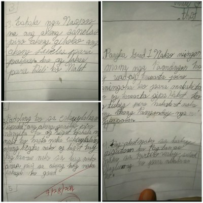 these were some of the answers written by students of my sister’s batchmate in HS. while written in the vernacular, it just highlights how they would do anything to be able to go to school. some of the kids walk as much as 2.5 hours from their home to their school in gaas, balamban. yes, that’s 2.5 hours, one way. that’s 5 kms every school day. not sure if they are walking with empty stomachs as well but i’m pretty sure they do not complain of “dying” from the long walk.