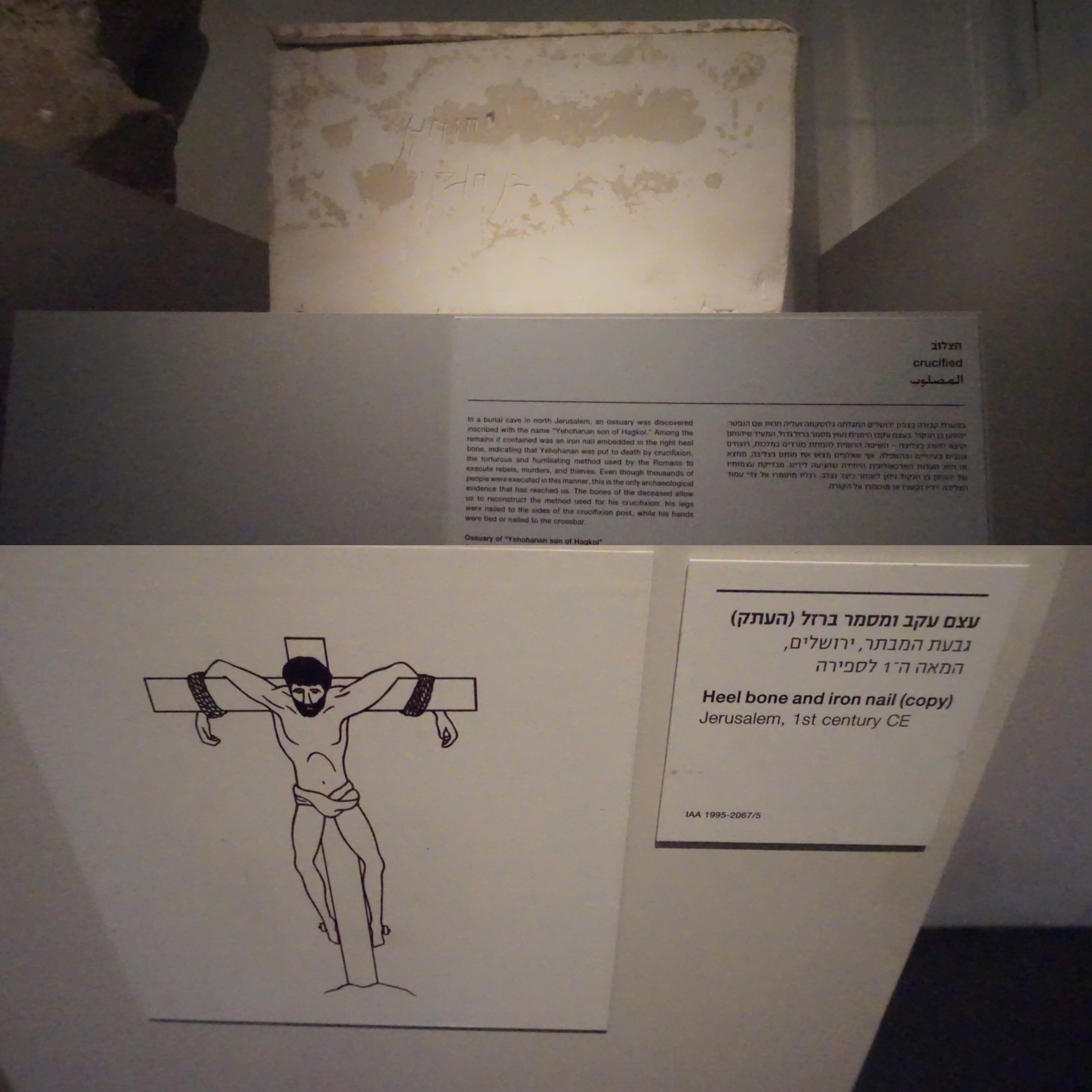 While walking through the numerous exhibits in the Israeli museum, I chanced upon this plain ossuary that contained the remains of a person who was crucified back in the 1st Century, CE. Crucifixion was a Roman way of executing rebels, thieves , murderers. This made me realize that crucifixion did become a practice centuries ago. That there were actually people who died from this method.